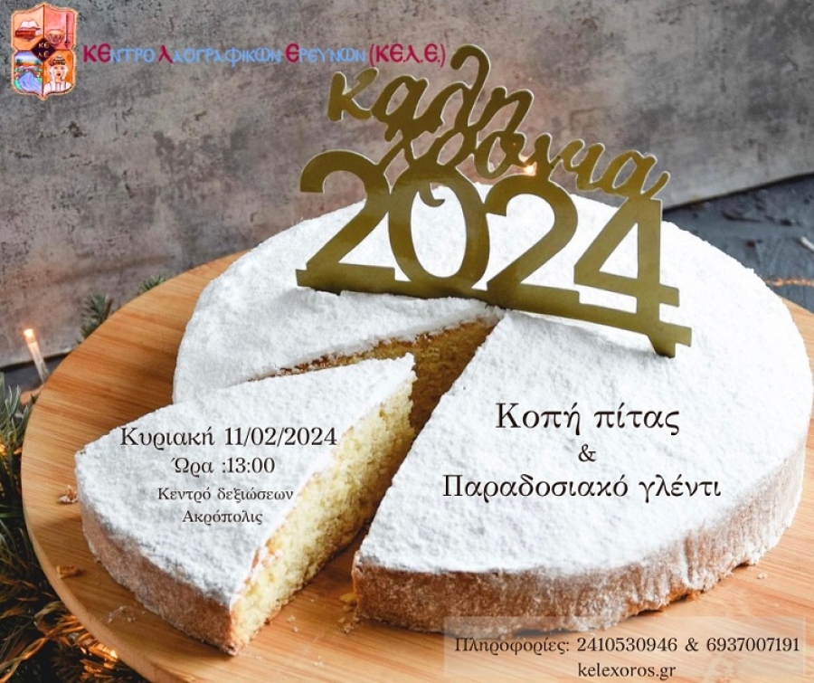 Το Κέντρο Λαογραφικών Ερευνών (ΚΕ.Λ.Ε.) θα κόψει την πρωτοχρονιάτικη πίτα του την Κυριακή 11/2/2024 το μεσημέρι 13.00μ.μ. στο κέντρο Ακρόπολις με πλούσια λαχειοφόρο και εξαιρετικούς μουσικούς που θα διασκεδάσουν τα μέλη και τους φίλους του ΚΕ.Λ.Ε.