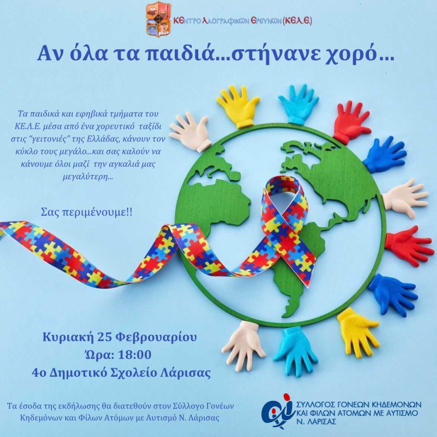 Την Κυριακή 25 Φεβρουαρίου στις 18:00 μ.μ. στο αμφιθέατρο του 4ου Δημοτικού Σχολείου της Λάρισας τα παιδικά και εφηβικά τμήματα του ΚΕ.Λ.Ε. μέσα από ένα χορευτικό ταξίδι στις «γειτονιές» της Ελλάδας, κάνουν τον κύκλο τους μεγάλο….και σας καλούν να κάνουμε όλοι μαζί την αγκαλιά μας μεγαλύτερη….