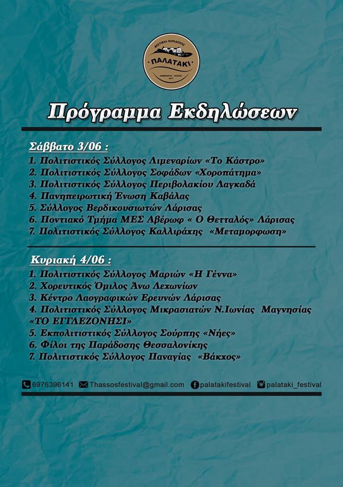 Στα πλαίσια μιας νέας συνεργασίας μεταξύ του Σύλλογος Γυναικών Λιμεναρίων Θάσου "Το Παλατάκι" και του ΚΕ.Λ.Ε. (ΚΕντρο Λαογραφικών Ερευνών) διοργανώνεται για πρώτη χρονιά το Φεστιβάλ Παράδοσης με τη συμμετοχή 14 Χορευτικών ομάδων και περισσότερων απο 300 χορευτών.